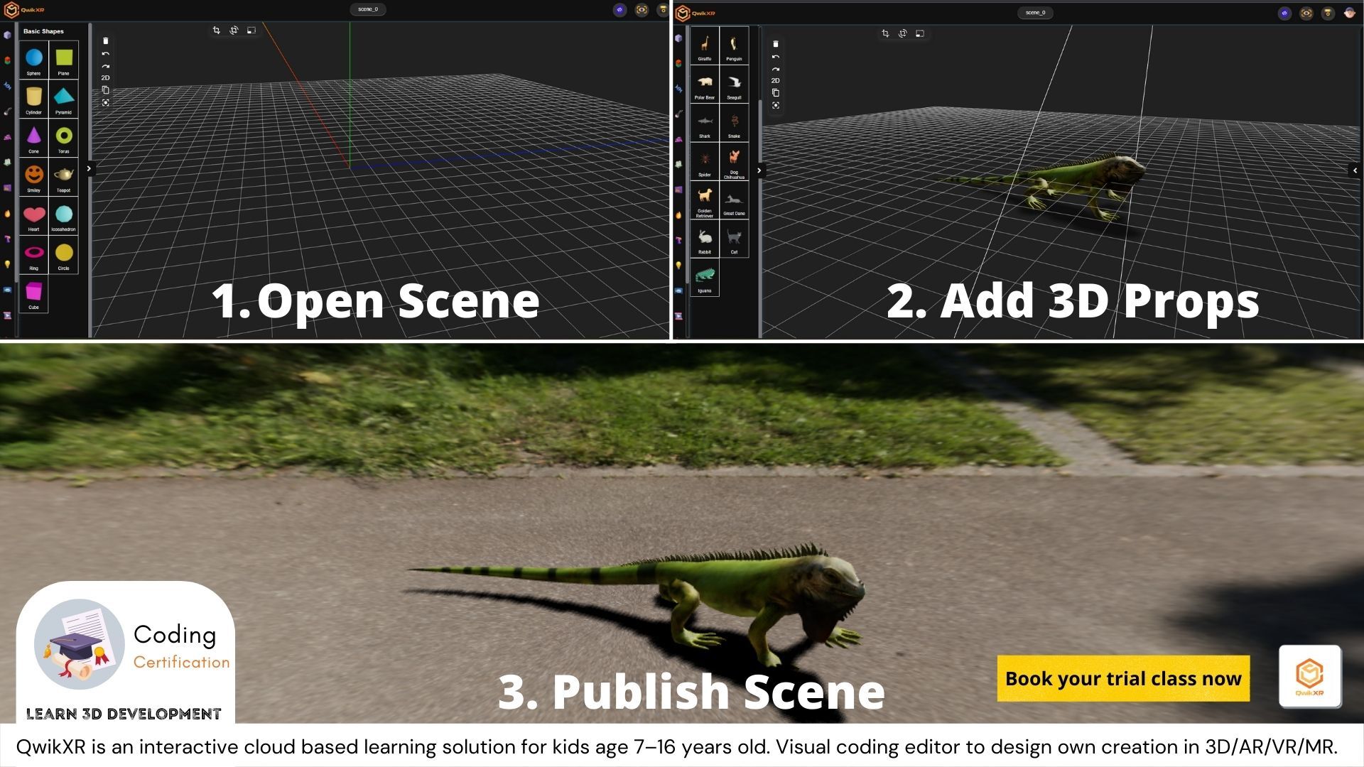 Coding platform QwikXR works on any computer in the internet browser via https://qwikxr.com. Alternatively, kids can use a tablet or smartphone without downloading any heavy applications. It is used in more than 10000+ schools all around the world and that can easily be used at home and on any devices.